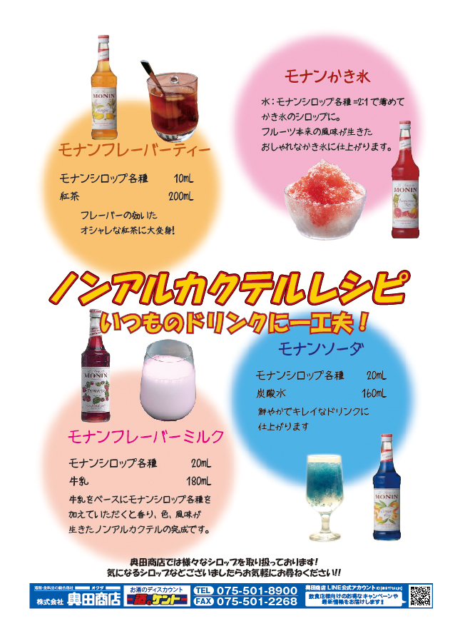 作成した2020年は、飲食店の営業時間縮小でアルコール提供ができない状態だったので、シロップを用いたノンアルカクテルレシピの調査と、販促対象の商品の選定を行った。